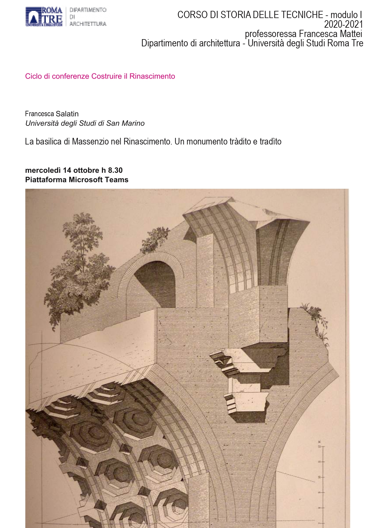 Si comunica che nell'ambito delle attività del corso di Storia delle Tecniche (prof.ssa Francesca Mattei - prof.ssa Tullia Iori) si svolgerà un Ciclo di conferenze Costruire il Rinascimento.