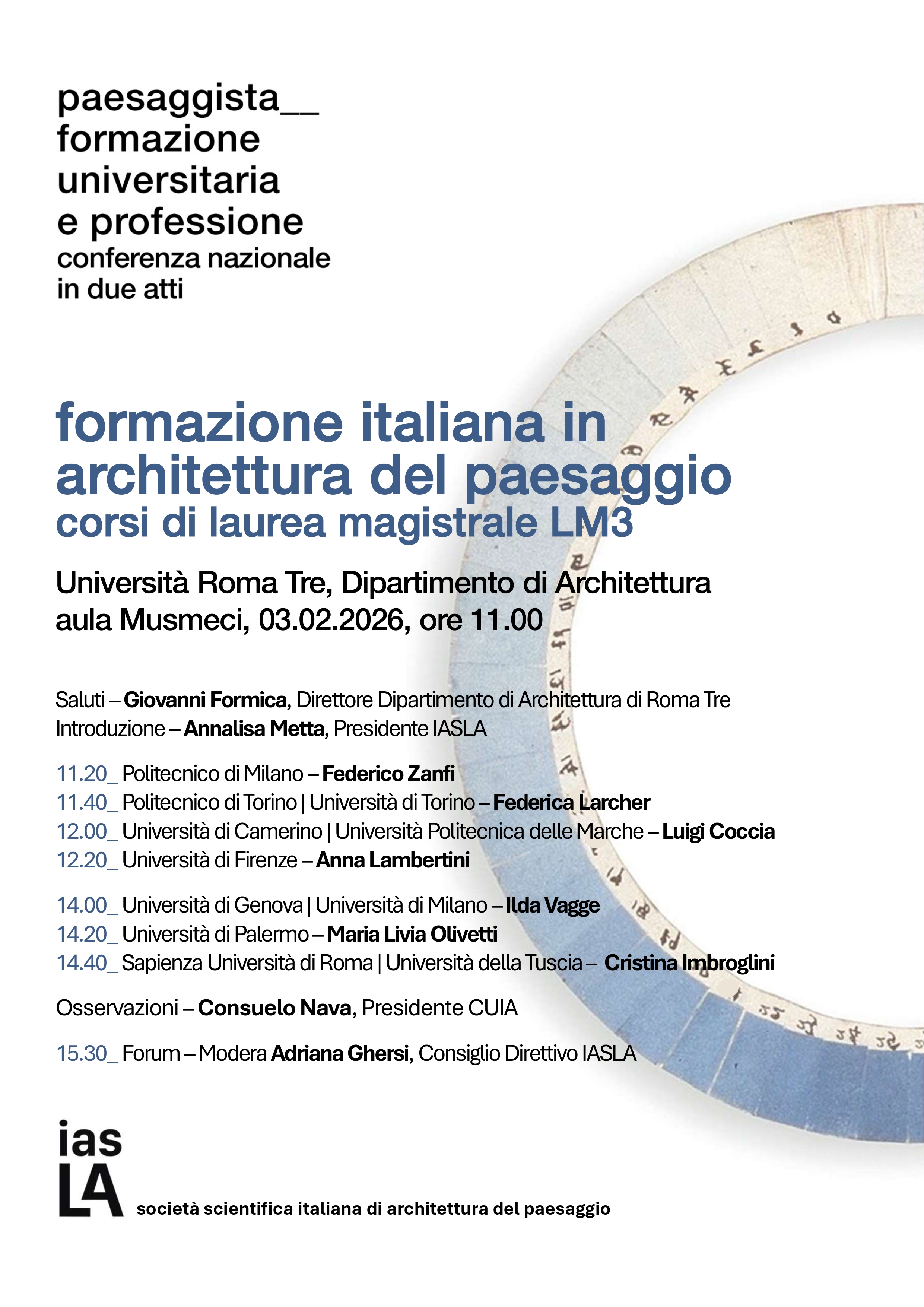 Alla giornata di studi partecipano i e le Presidenti dei corsi di laurea magistrale LM-3 attivi su tutto il territorio nazionale e la Presidente della Conferenza Universitaria Italiana di Architettura, per delineare un ritratto corale della formazione universitaria in architettura del paesaggio e condurre una riflessione allargata su risultati, obiettivi e criticità.