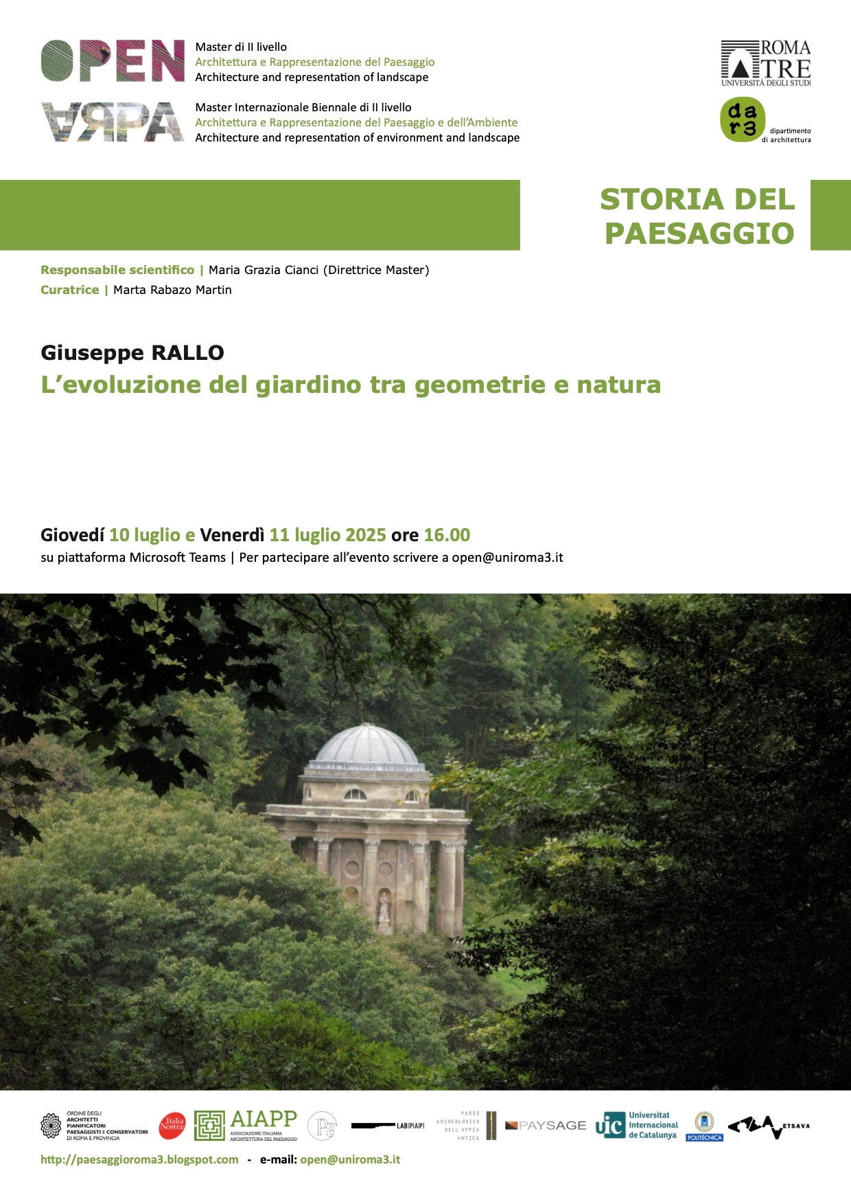 Gli OPEN DAYS sono un ciclo di incontri aperti attraverso cui il “Master di II livello OPEN” si rivolge all’approfondimento ed alla divulgazione delle tematiche inerenti al paesaggio e alla sua rappresentazione. Attraverso inviti rivolti a studiosi e professionisti di livello nazionale ed internazionale, le giornate studio affrontano di volta in volta uno degli aspetti che articolano la complessità del paesaggio nei suoi intrecci con la storia, la natura, il progetto e l’analisi della città e del territorio.