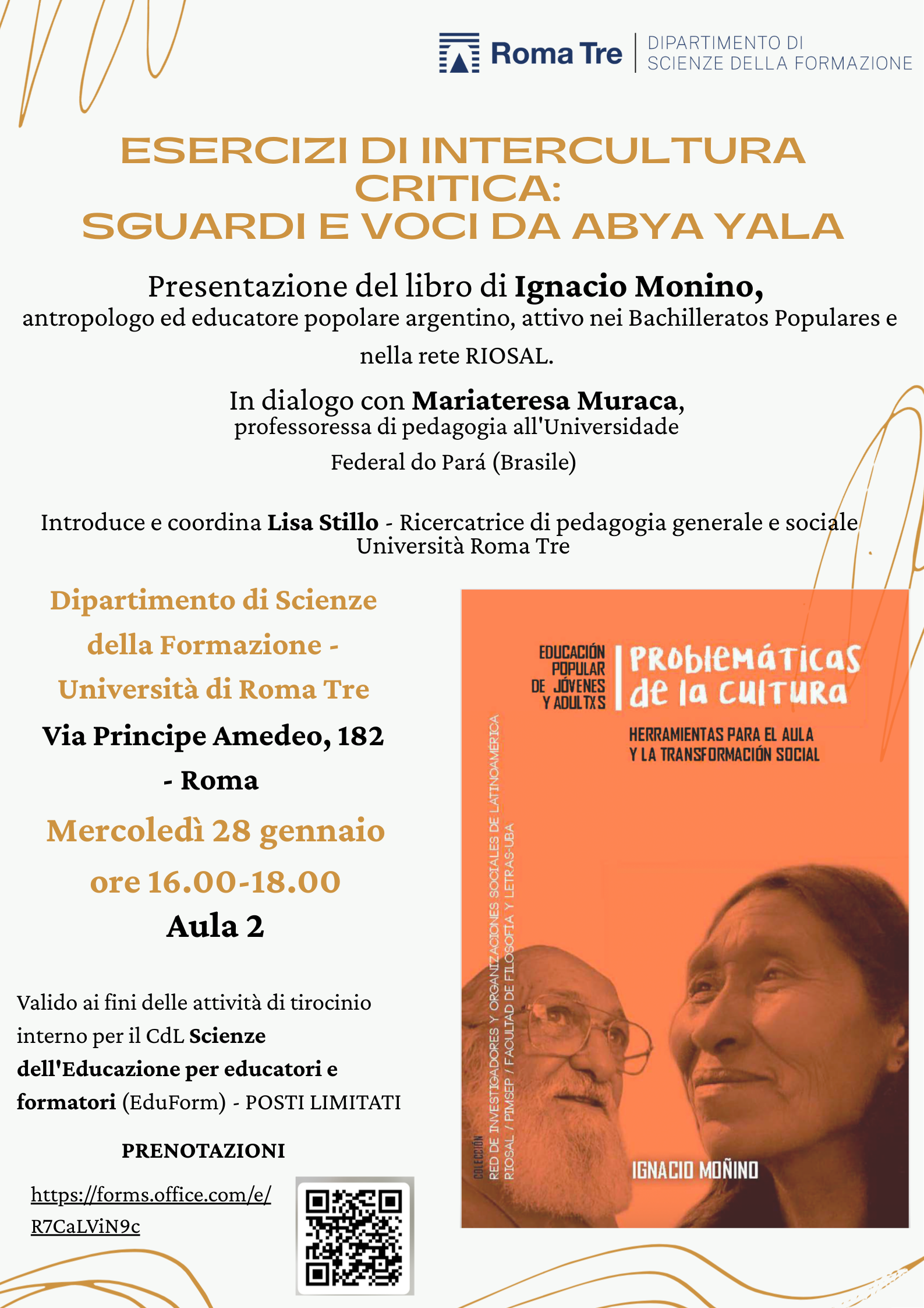 Mercoledì 28 gennaio 2026, dalle ore 16 alle 18, presso il Dipartimento di Scienze della Formazione (Aula 2 - Via Principe Amedeo, 182b), si terrà la presentazione del volume “Problematica de Cultura. Herramientas para el aula y la transformación social” di Ignacio Monino, antropologo ed educatore popolare argentino, attivo nei Bachilleratos Populares e nella rete RIOSAL (Red de Investigación en Educación Popular y Movimientos Sociales) in Argentina.
