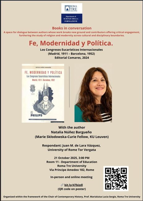 Il libro che sarà presentato in questo primo incontro è Fe, Modernidad y Política. Los Congresos Eucarísticos Internacionales (Madrid, 1911 – Barcelona, 1952) (Editorial Comares 2024).