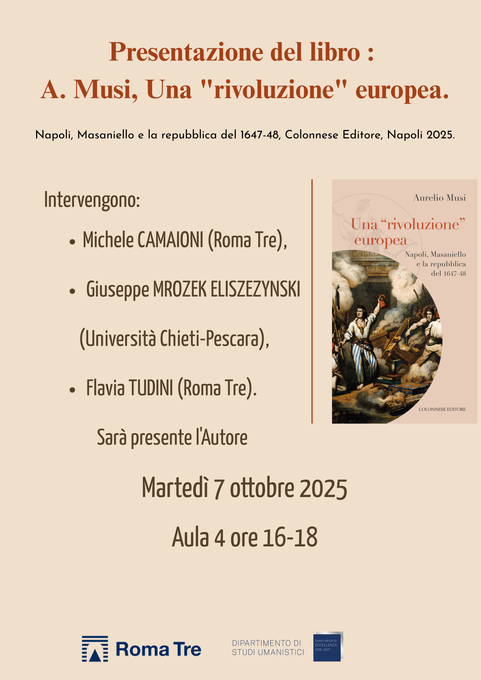 Presentazione del libro : A. MUSI, Una "rivoluzione" europea. Napoli, Masaniello e la repubblica del 1647-48, Colonnese Editore, Napoli 2025.