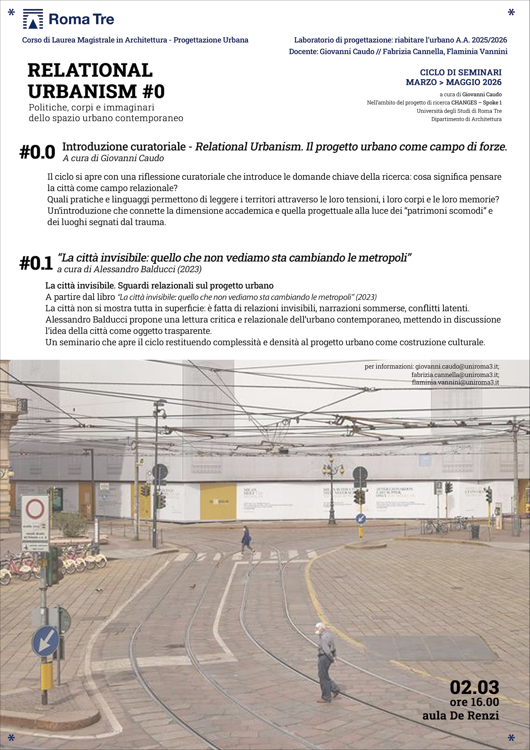 Lunedì 2 marzo, nell’ambito del progetto di ricerca CHANGES – Spoke 1, all'interno delle attività didattiche del Laboratorio di progettazione: riabitare l'urbano, per il ciclo di seminari Relational Urbanism. Politiche, corpi e immaginari dello spazio urbano contemporaneo, dopo una introduzione a cura di Giovanni Caudo è previsto il seminario di Alessandro Balducci